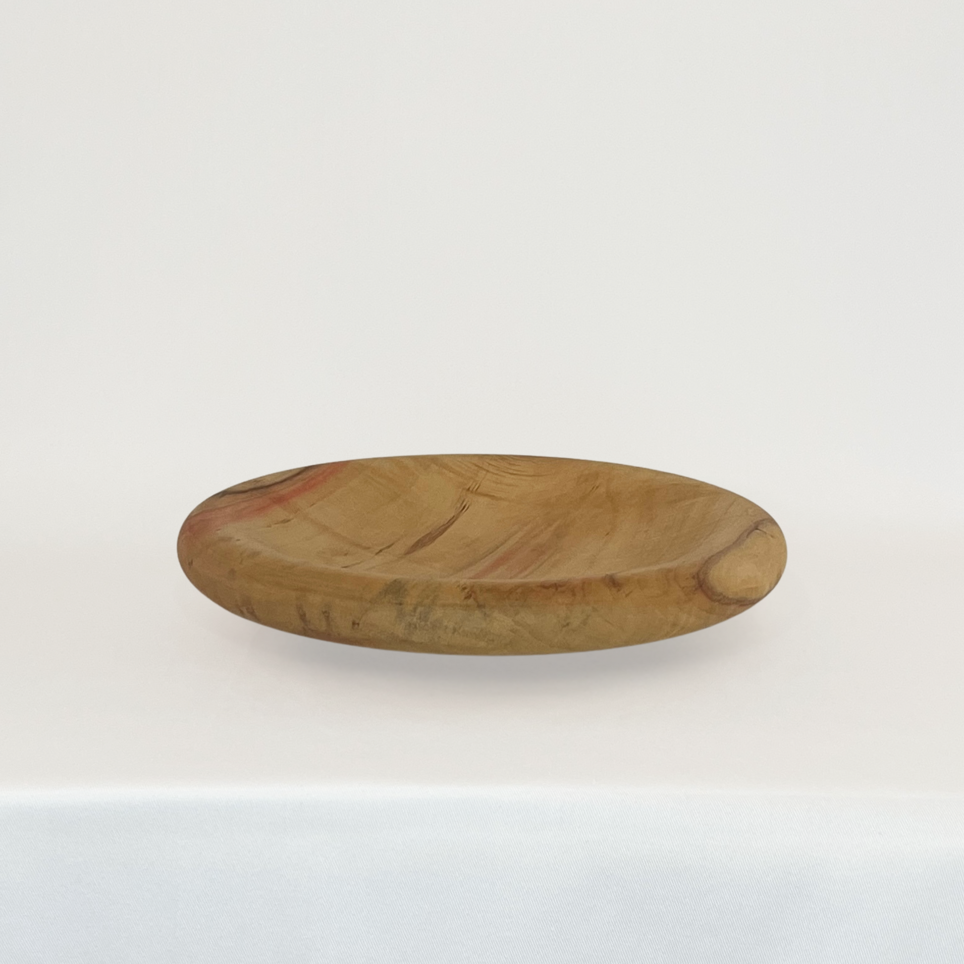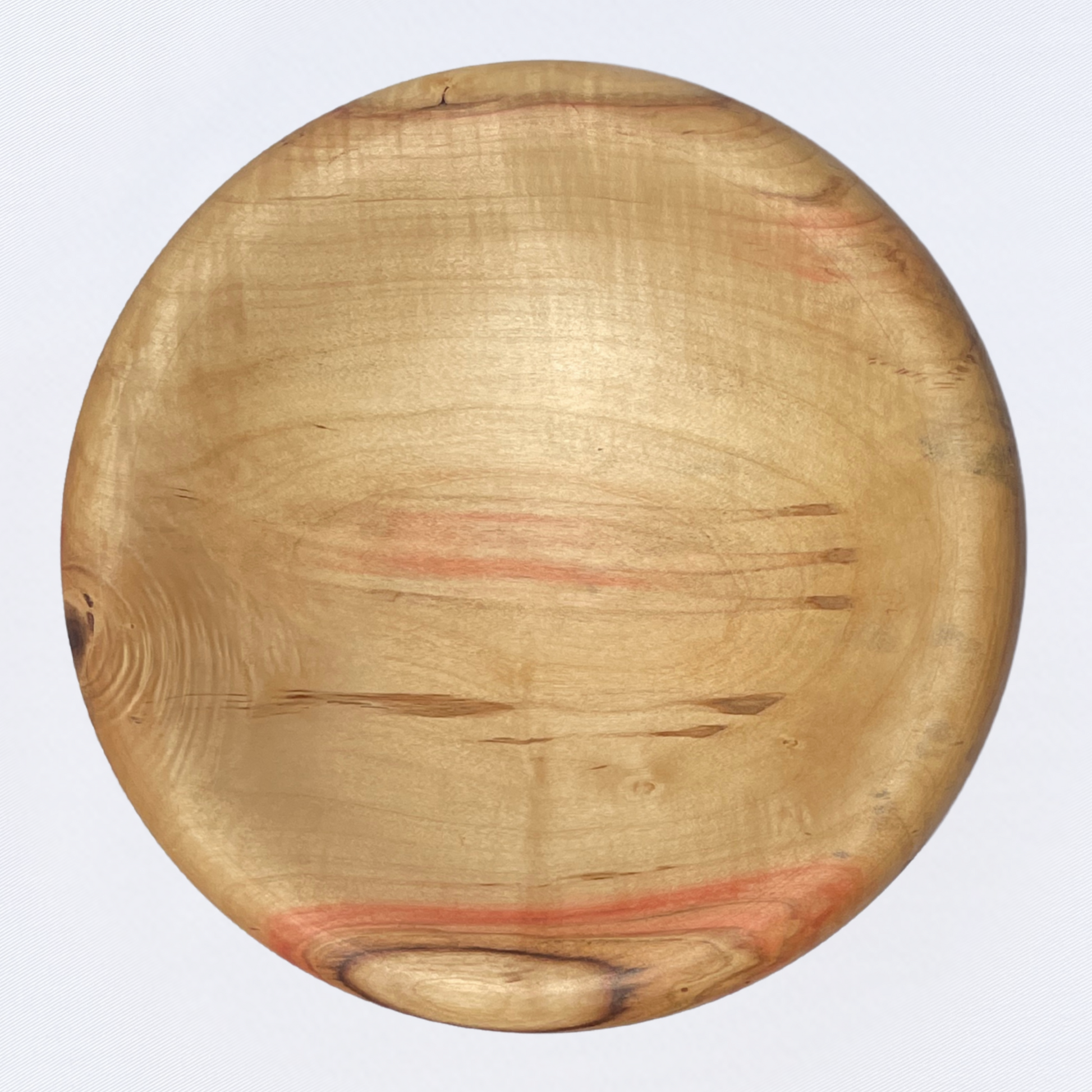 This lathe-turned bowl sits so low that you can't see its foot, creating the illusion that it is floating. Box elder is a type of maple wood that often has pink/red streaks like the ones in this piece, though these could turn brown over time. Super-smooth texture and finished with polymerized linseed oil and beeswax.