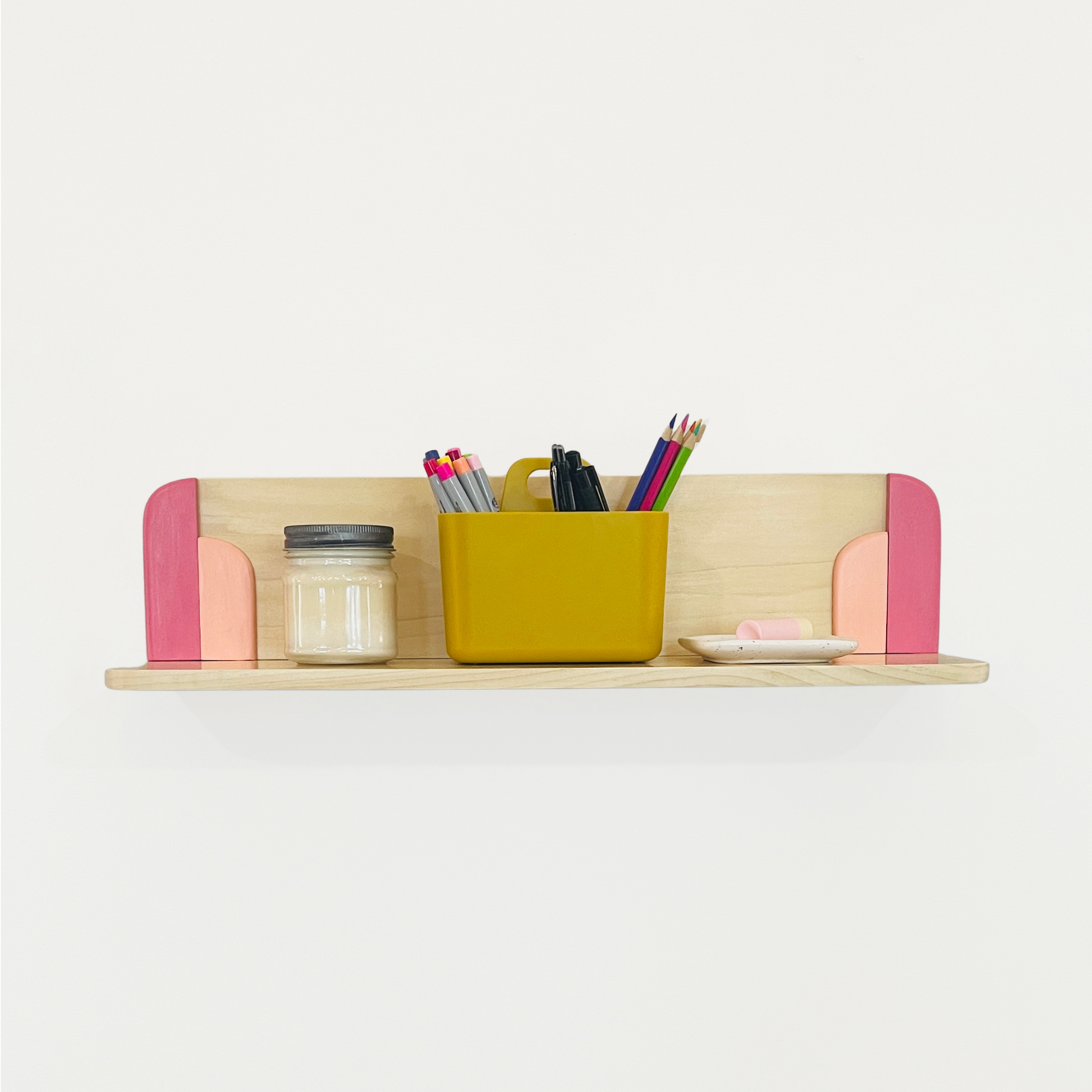 The bright and cheery Poppy solid wood wall shelf combines expert craftsmanship with a modern aesthetic. Made from smooth, natural-finished poplar, it showcases the wood’s unique grain alongside hand-shaped, sanded, and finished decorative art deco accents in two shades of pink. Designed as both a functional storage solution and an elegant statement piece, it’s ideal for displaying art, plants, or pottery. Each shelf is made to order; please allow two weeks for production and shipping.